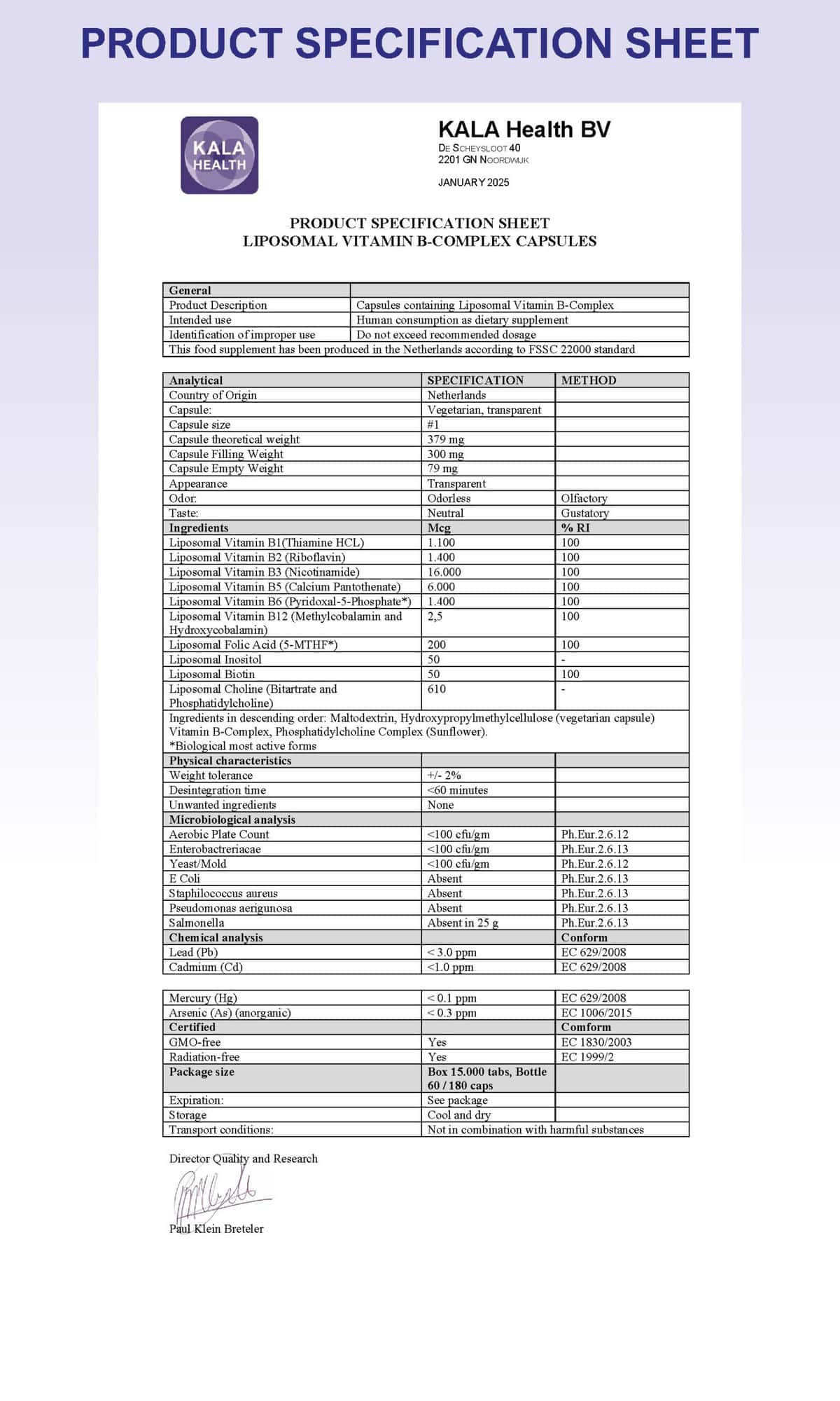 Liposomaler B-Komplex ist Teil der liposomalen Produktlinie von Kala Health. Alle Produkte dieser Linie werden mit der gleichen Lipo-Real® Technologie hergestellt: echte trockene Liposomen, die im Verdauungstrakt spontan aktive Liposomen bilden für optimale Aufnahme.