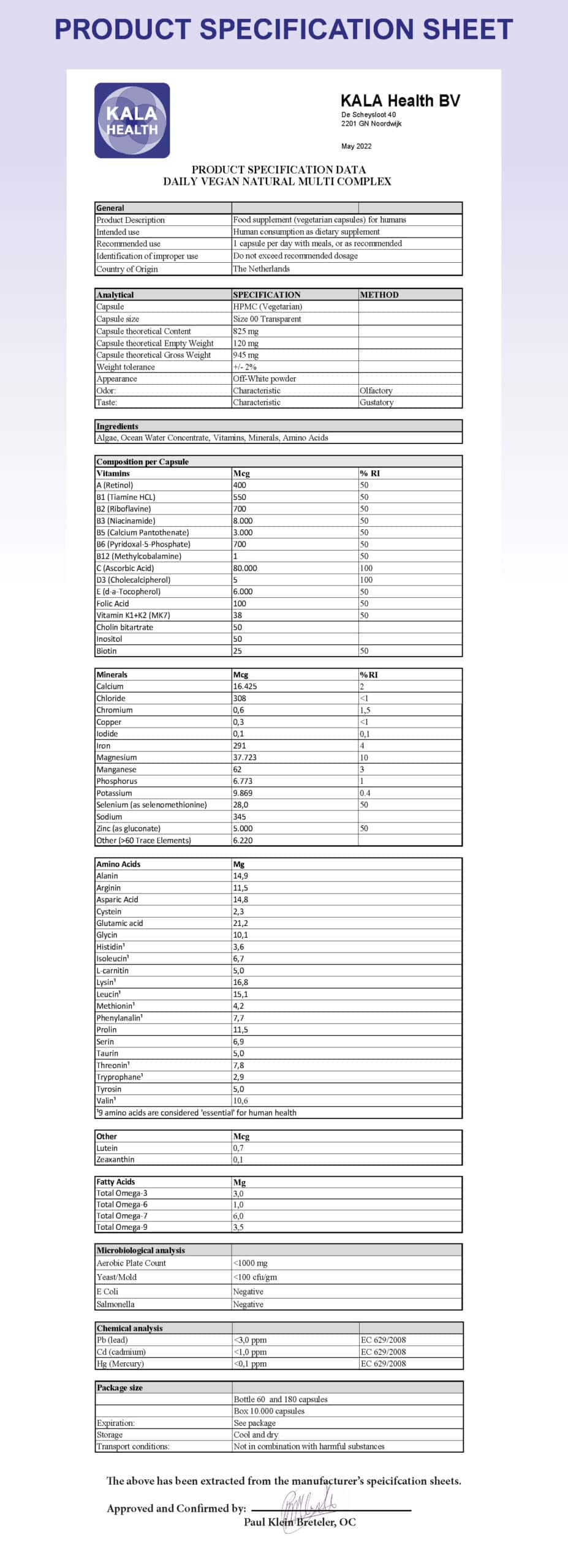 Paul Klein Breteler, Gründer von Kala Health seit 1997, entwickelte dieses Multivitamin nach seiner Überzeugung, dass Mineralstoffe und Spurenelemente die wichtigste Basis für Supplementierung sind. Diese Formel kombiniert die Kraft des Ozeans (Algen und Meerwasser) mit orthomolekularen Dosierungen von Vitaminen in ihren biologisch aktivsten Formen. Vollständig produziert in unserer FSSC 22000 zertifizierten Fabrik in den Niederlanden, vom Rohstoffeinkauf bis zur Kapselierung.