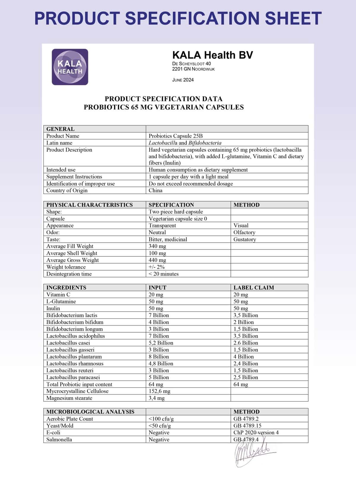 Jeder Rohstoff wird getestet, bevor er in die Produktion geht. Wir prüfen auf Identität, Zellkonzentration und Verunreinigungen. Das Endprodukt testen wir über Eurofins, ein unabhängiges, RvA-akkreditiertes Labor, auf Krankheitserreger (E. coli, Salmonella), mikrobiologische Reinheit und Identitätsanalyse je Stamm. Das Product Specification Sheet und die Laboranalyse sind in der Produktgalerie auf dieser Seite öffentlich einsehbar.