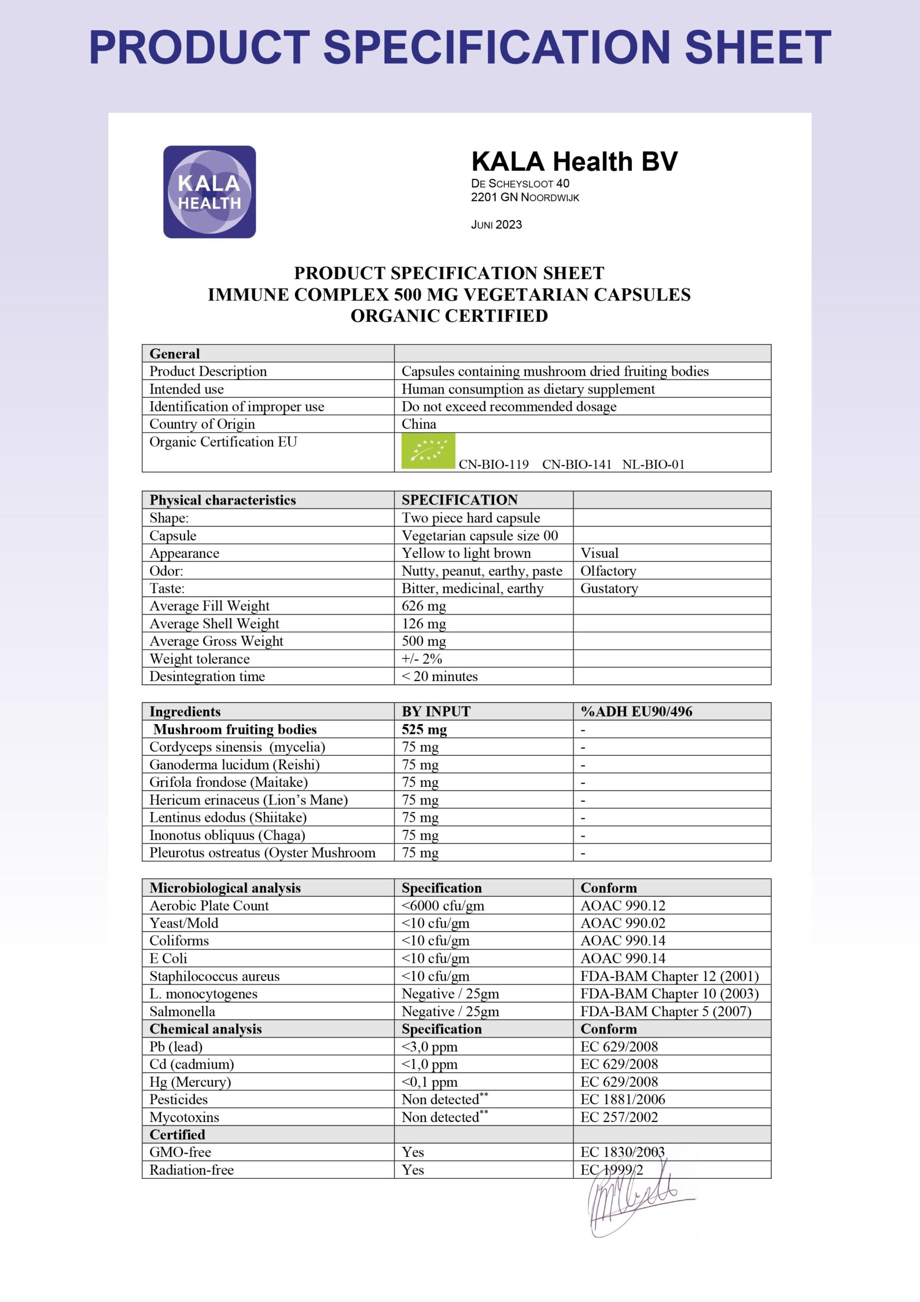 Die Pilze in Vegan Pilzmix BIO sind garantiert von höchster und biologisch aktivster Qualität. Weil Pilze die Umgebung widerspiegeln, in der sie wachsen, ist die Qualität der Pilze von größter Bedeutung. Pilze sind in der Lage, fast alle Stoffe aus dem Boden aufzunehmen und umzuwandeln, sowohl wertvolle als auch möglicherweise schädliche. Pilze, die in einer verschmutzten Umgebung wachsen, können diese Schadstoffe ebenfalls aufnehmen. Aus diesem Grund verwendet Kala Health keine wilden Pilze aus unkontrollierten Gebieten in unkontrollierten Ländern.